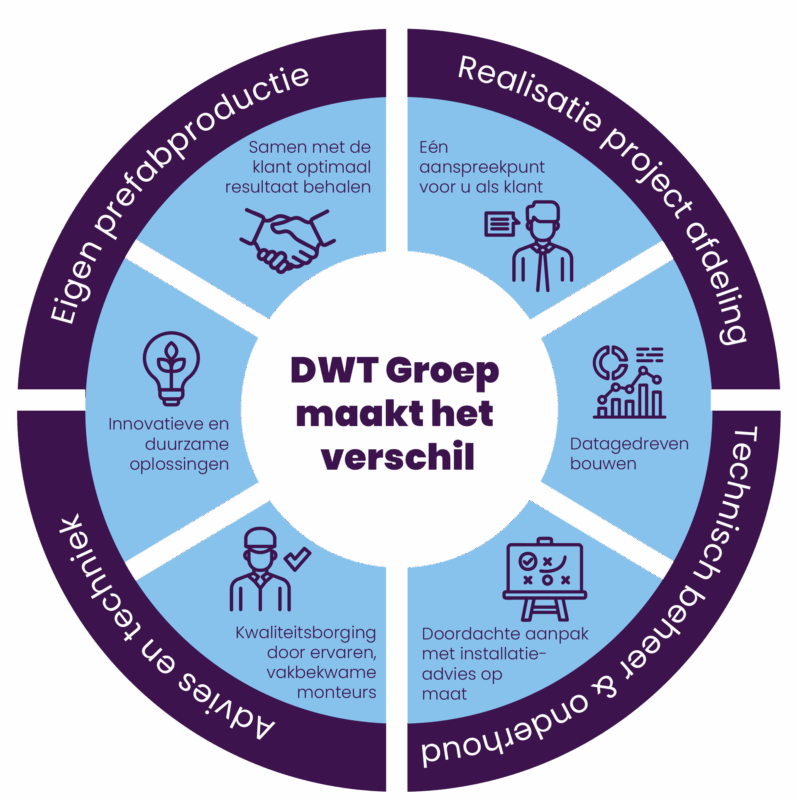 DWT Groep levert een compleet pakket aan installatietechniek voor zakelijke gebouwen. Van nieuwbouw en renovatie tot beheer en optimalisatie van bestaande installaties. Dankzij onze brede expertise hoeft u niet te schakelen tussen meerdere partijen: wij overzien het geheel en zorgen voor samenhang tussen alle disciplines.