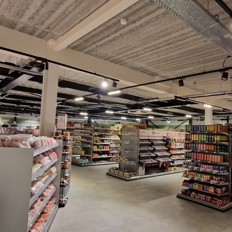 Als totaalinstallateur is de E-, S- en W-installaties gerealiseerd in de nieuwe supermarkt, het gerenoveerde/gemoderniseerde theater met nevenruimtes en zeven appartementen boven de supermarkt.
