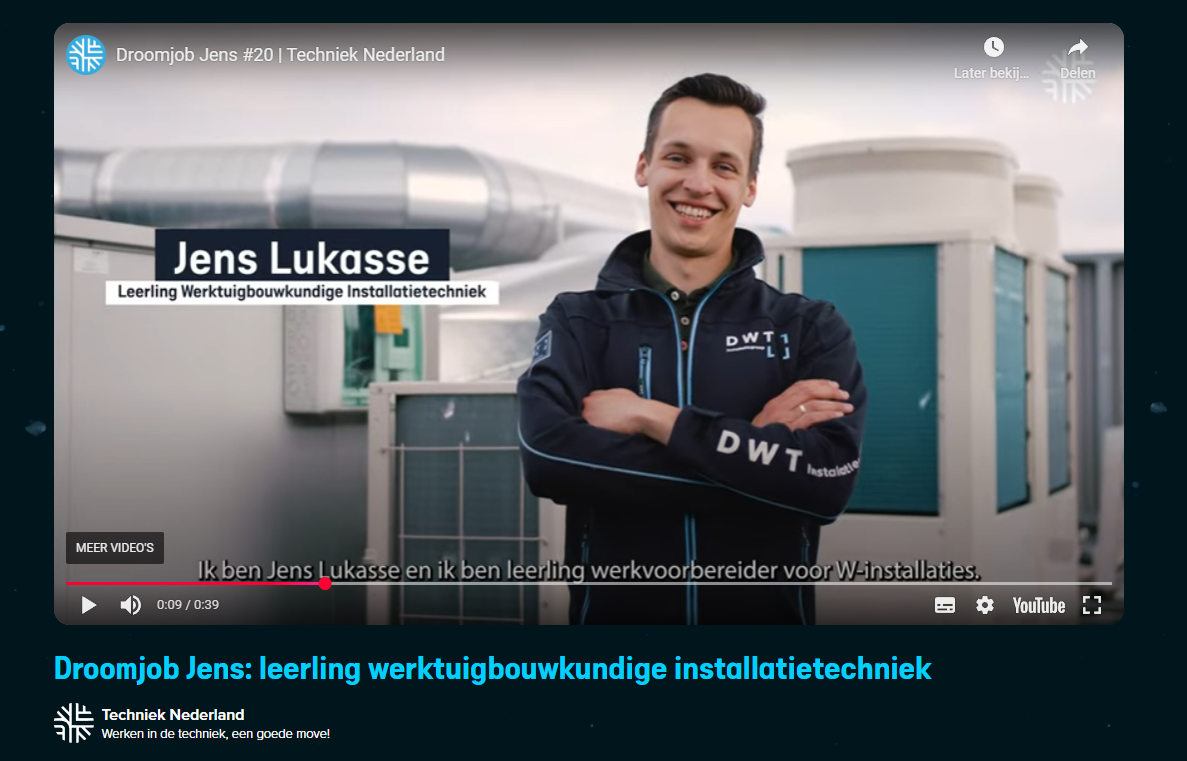 Bij DWT installatiegroep zijn we trots op ons vak én op onze mensen. Onlangs kregen onze leerling werktuigbouwkundige installatietechniek Jens en zijn leermeester Hubrecht de kans om samen te schitteren in een video van Techniek Nederland | Droomjob.