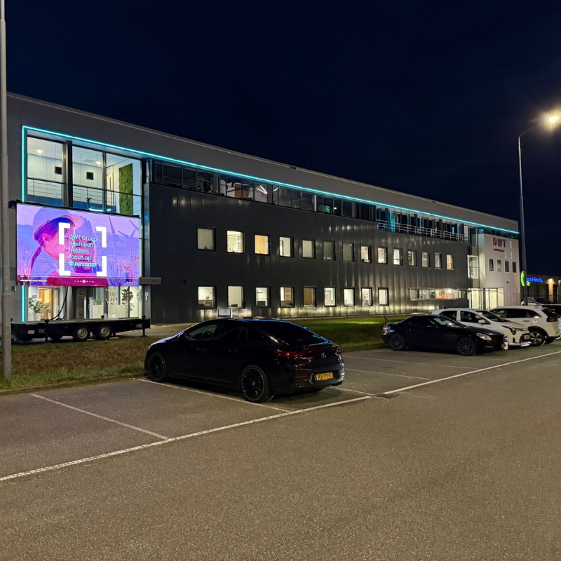 Wij hebben sinds maandag een groot LED scherm staan bij ons kantoor in Goes, vanaf de parkeerplaats van De Zeelandhallen is deze goed te zien!